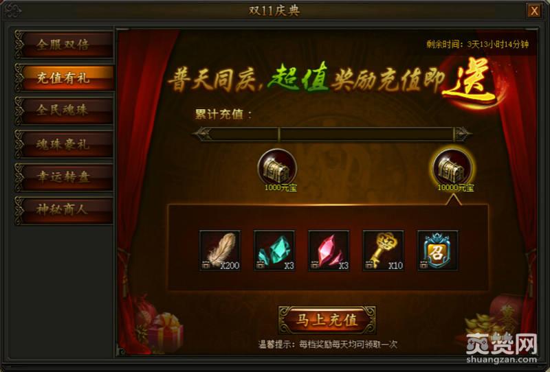 2、充值有礼活动。双11活动当然要剁手啦。传奇霸业当中有相对的充值送道具的活动。如果玩家朋友充值了1000元宝,那么可以获得转生丹、探宝的钥匙和法神的令牌。加快玩家的转生,能够快速的提升战斗力。如果玩家充值了10000元宝,那么可以获得羽毛的升级材料和boss召集令。最重要的就是这个召集令了,能够马上让你获得极品装备哟。这个活动是每天都可以领取的。
