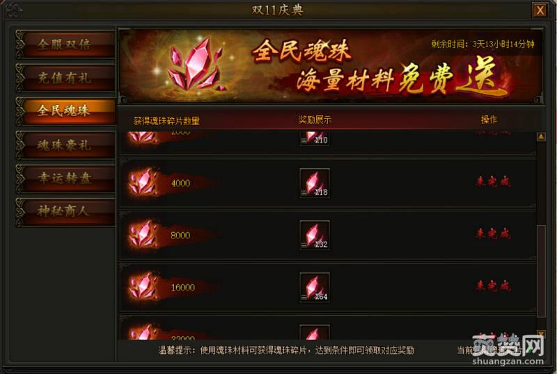 3、全民魂珠活动。使用魂珠材料就能够获得魂珠的碎片,达到相对应的条件就能够获得奖励。魂珠作为传奇霸业当中比较重要的战斗力提升要素,重要度不言而喻。
