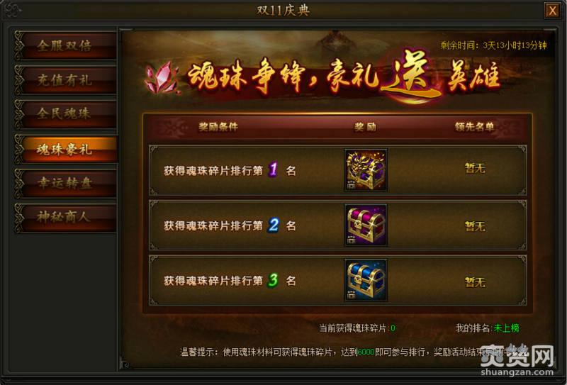 4、魂珠排名高。这实际上是前面一个活动的补充,排行榜前三的能够获得奖励。奖励是从各种极品装备当中随机挑选的。