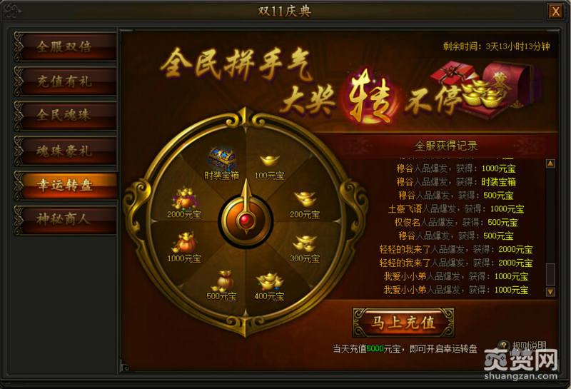 5、幸运转盘。这就是一个看脸的游戏了,充值5000元宝就可以开启转盘了,能够抽到什么,就看你的手气了。