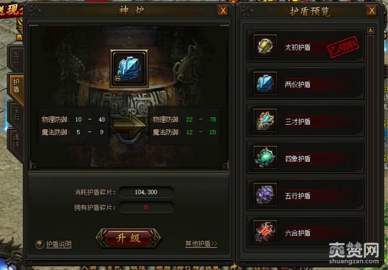 2、护盾。在护盾系统当中,能够大幅度的提升人物的魔法防御和物理防御。护盾会随着护盾碎片的增多而增加经验,从太初盾牌一直升级到六合盾牌。护盾是可以注灵的,但是小编建议不要把太多的精力放在护盾上面,提升攻击力才是王道。
