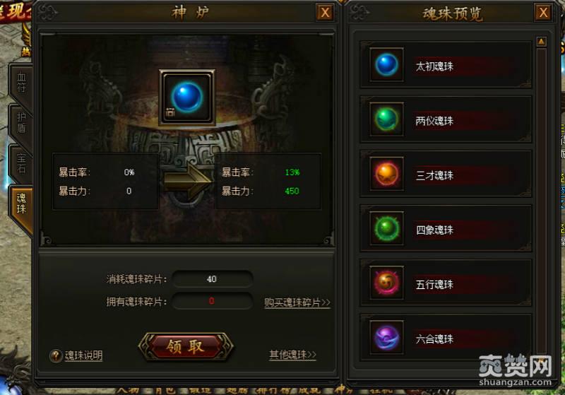 4、魂珠。魂珠提高的是暴击几率以及暴击力。想要一次攻击秒人么,魂珠升级是你的不二选择。魂珠在一般的系统当中实际上不是很好升级,所以花一点元宝在商城购买魂珠上面比较实在。魂珠的升级是在神炉当中最重要的,所以玩家如果想要主要升级一个的话,小编建议就是魂珠了。