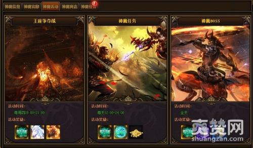 神魔活动是阵营的主要玩法,神魔活动包括王座争夺战、神魔任务跟神魔BOSS。