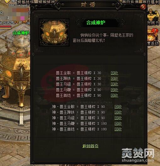 当玩家拥有多余的兽王装备时,不妨进行回收吧。兽王装备的回收不同于一般的装备,回收需要到神炉处进行。
