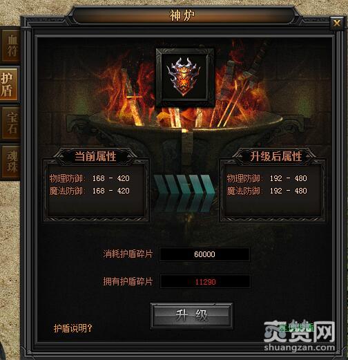 护盾相较于内功来说,则是更加地注重于外在的保护。累死与一层钢铁侠的盔甲,能够保护你免受皮肉之苦。而且,经过比奇城铁匠的多年研究后发现,护盾虽然不 能自动地飞来,但是却十分地轻便易于携带。《传奇盛世》护盾总共分为十级,等级越高的护盾能够给角色提供上更高的物理和魔法防御加成效果。即使是 低等级的护盾也可以通过消耗护盾碎片进行升级,进阶成为更高级的护盾。