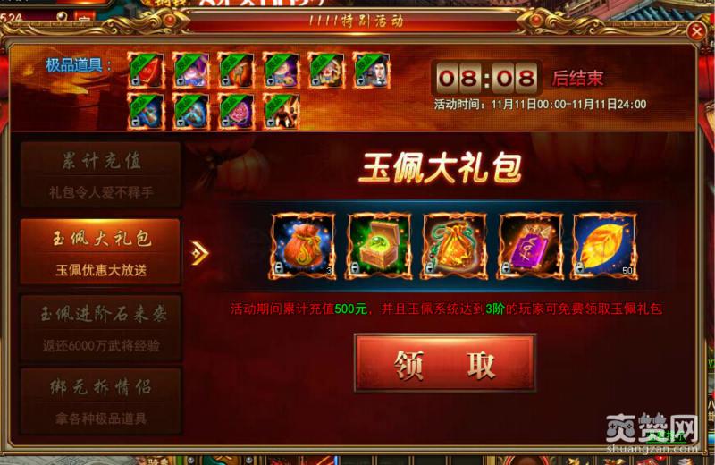 2、玉佩大礼包。这实际上和之前的充值奖励有一点像。要求充值的金额达到500元,并且玉佩的系统到了3阶就能够免费领取相对应的礼包了。礼包当中有重铸卡和金叶子。如果小伙伴们在玉佩的升级上面遇到了一点苦难,那么小编还是建议可以购买的一个的,毕竟双十一,价格还是非常优惠的。