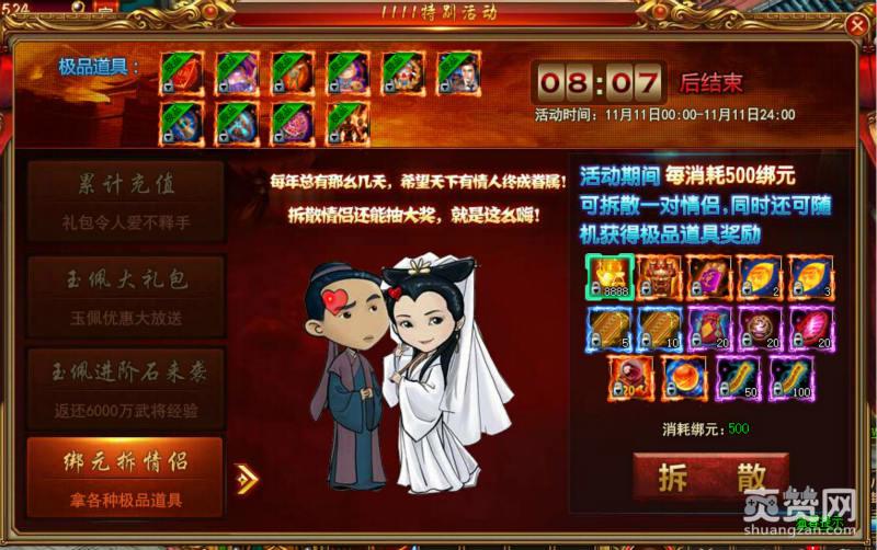 4、绑元拆情侣。最后一个活动可能带着策划的怨念。只要消耗500的绑元,就嗯呢够拆散一对情侣,能够获得一个抽奖的机会。最高有8888的元宝等着你哦。