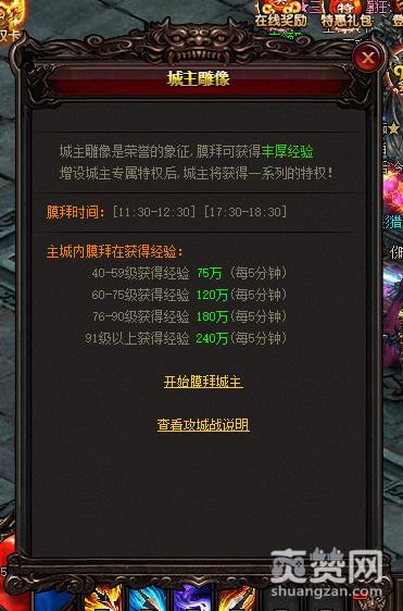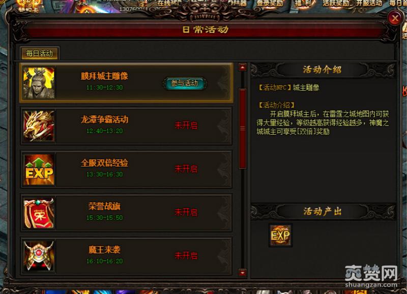 之后我们要做的任务是恶魔神殿,在固定时间开启后,能够有非常多的都是稀有的BOSS,但是小编在这里要提醒,最好还是加一个帮会,加了帮会之后我们才有后盾,能够在活动当中得到非常大的助力。膜拜城主当中,活动在11:30~12:30和17:30~18:30中开放,一般来说这两个时间段正好是吃饭的时候,所以小编是吃饭的时候就挂着那里开始做这个活动,总的来说在这里的经验还是非常的多的,和开双倍在挂机地图是差不多的。