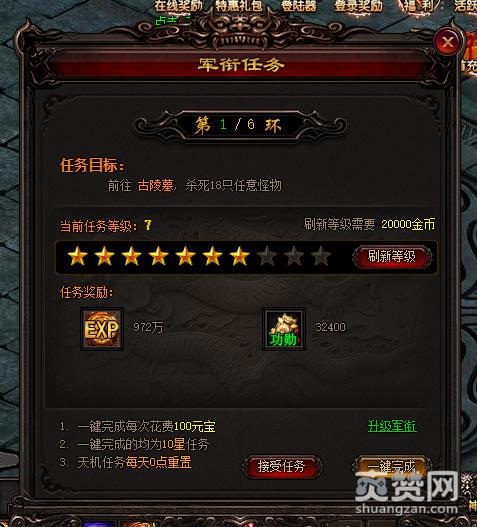这里小编建议一定要的任务就是妖除魔任务,每天都可领取12次。很多玩家在点击任务的过程当中,直接就接取任务了,但是实际上这个任务是有星级的存在的,如果玩家完成任务星级越高,那么在完成任务之后玩家活的奖励才会越好,所以在雷霆之怒之中,如果玩家朋友们想要要获得大量经验值的话,那么还是花费一定的元宝刷高任务的星级比较实在,最高是十级。在做完任务之后,多倍经验的领取也是比较需要的,领取就不用大量的元宝了,只要金币就可以了。