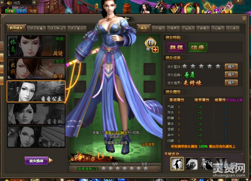 3、香香公主。这个侠女在开服的第二天就可以获得了。是一个奶妈的角色,无论是pvp还是pve都可以说是非常的好用的。但是小编玩了一下,发现治疗的效果并不是很好,治疗量不大,所以小编觉得不是特别好用,所以如果是pve挂机刷本的玩家,那么小编觉得还是可以使用一下的。