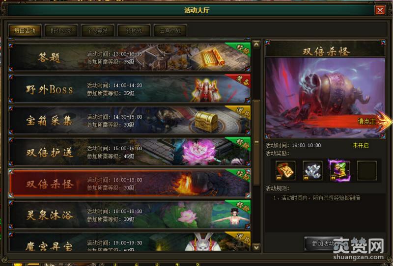 这是在花千骨当中最简单,但是最有用的活动了,但是小编提醒小伙伴们,这个活动只有30级之后可以参加。不过30级只要直接主线任务升级就可以了,所以不用担心。双倍刷怪活动的开启时间是每天16:00到17:00。不用选择特定的地图,而是要选择和自己等级合适的地图,因为在这个时间段内无论在什么地图杀怪都是有双倍经验的,在这个前提下小编建议使用一些高级的道具,比如5倍经验丹、10倍经验丹,那么获得的经验那就是10倍、20倍。我们简单的来算一夏,一个小时挂机升1级,如果在这个时间段使用5倍经验丹,那么最少可以升6、7级,毕竟高级需要的经验会更多一些,就算是挂机也会非常受益。所以在这个时间一般都会使用简单的丹药,去与我们等级差不多的地图挂机,或者选择这个时间段完成帮派任务和每日任务获得的经验是非常可观的。