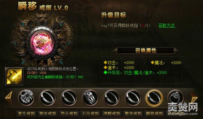 3、瞬移戒指。在这个世界上面,时间这种东西是无法掌握的,如何节省时间是我们在人世生活的当中一直想要知道的一个问题。瞬移戒指能够直接传送到目标地点,能够让我们节省下非常多的时间。并且在pvp当中,我们也多了一个瞬移技能,非常强大。Vip7可以获得。