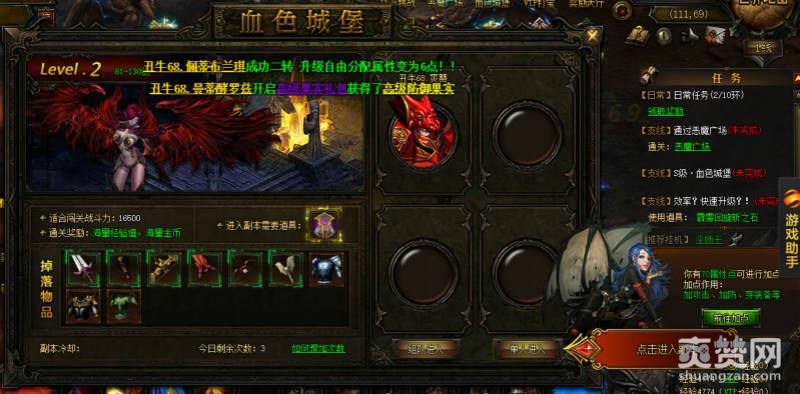 首先进入的方式非常的简单,在我们的游戏界面的右上角,就能够看到血色城堡的入口了。点击一下血色城堡的图标就能够打开血色城堡的界面了。在血色城堡的界面,我们可以看到这个血色城堡的等级是几级到几级的。适合闯关的战斗力是多少,在通关了之后,我们能够获得的奖励是什么。并且boss掉落的物品又是什么?并且要知道副本并不是你想进就可以进的,还需要挑战券,在这方面界面上也会告诉你进入血色城堡的道具是什么。我们可以选择组队获得单人进入到副本当中。