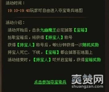 烈焰夺宝奇兵每天晚上19:10-19:40会在沙漠土城召开,玩家们在活动时间内可通过夺宝奇兵NPC进入活动副本中。新手玩家可使用传送石头——沙漠土城——地图指引到夺宝奇兵。活动副本内玩家相互攻击没有PK惩罚,死亡不会掉落装备,大家可以尽情相互争抢宝箱,下面细说下活动规则。