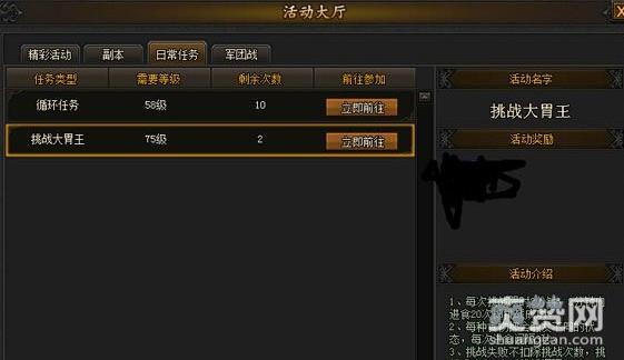 首先就是这个活动的参与条件:只有70级以上玩家可以挑战,而且每天可以挑战两次。因为需要消化食物,所以说两次挑战之间有一小时的间隔。不然就撑坏肚子了。要完成的挑战目标:玩家需要在2分钟内进食20次方可成功,如果失败不计入挑战次数。挑战详情: