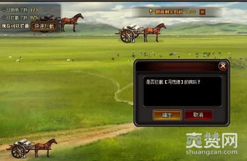 玩家朋友们可以点刷新按钮获得更高品质的商队,商队品质越高,获取的黄金越多。VIP3以上玩家可以直接开通“丝绸之路”。如果拦截皇家商队的话,那么有10分钟的冷却时间,点击冷却时间右边处的小箭头可以消耗元宝快速冷却。击败皇家商队后可以获得珠宝等丰富奖励。