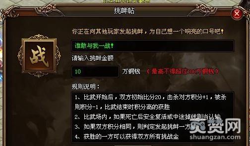 下面小编就来说一说这个的玩法:1、点击另外一个人物进行“挑衅”后,玩家朋友就可以编写自己的挑衅的口号,最后同时与押注挑衅金额,一般来说金额为铜钱,很高不很过100万铜钱。要注意的是这个的金额一旦确认不得修改,进入比武场后双方玩家共同扣同样除押注的金额,获胜一方可以获得双方所有挑衅金。