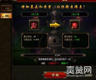 火魄:等到玩家达到73级就会开启提炼的另一功能:火魄。攻击力会有大幅度的增加。等到玩家也会在功能开启后获得一块1级火魄,该道具会提升玩家的暴击和伤害,让玩家驰骋江湖。火魄可通过火魄碎片进行升级,野外boss都能掉落该道具,玩家也可以在商城直接购买。目前一共有12种火魄供玩家获得。